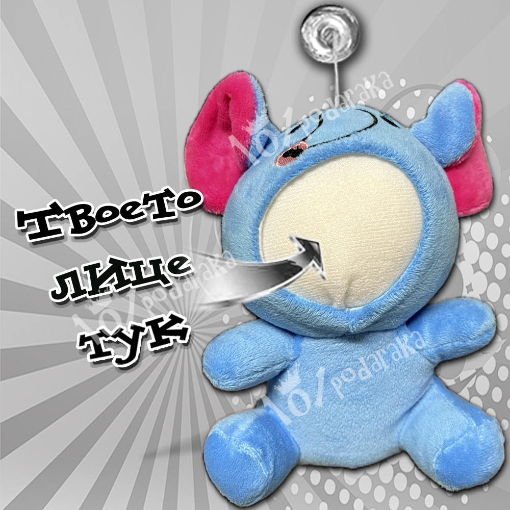 Предлагаме ви плюшена играчка, която може да бъде изработена с вашето лице. Плоюшена играчка слонче е специално създадена, за да може да се персонализира с различни лица. Освен това образът е от висококачесвена PVC хартия, която е с 3D извивки. Всяко лице има изпъкнал нос и леки вдлъбнатини около зоната на очите. Цялото лице наподобява човешки образ, защото е извито и изпъкнало. Поставено върху играчката, придава абсолютна завършеност и тя оживява със съваршенната идентичност на човешко лице.